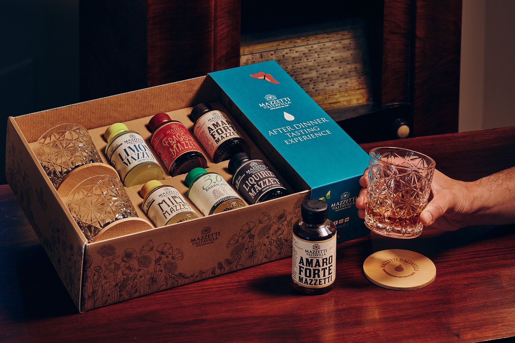 Tout ce qu'il faut pour vivre le digestif sous le signe de « l'esprit du Piémont » ! Kit dans lequel la liqueur et la grappa ouvrent la voie sensorielle vers le moment du « dessert » et prolongent la convivialité et le plaisir gustatif grâce à la présence de tous les accessoires indispensables pour une soirée inoubliable.